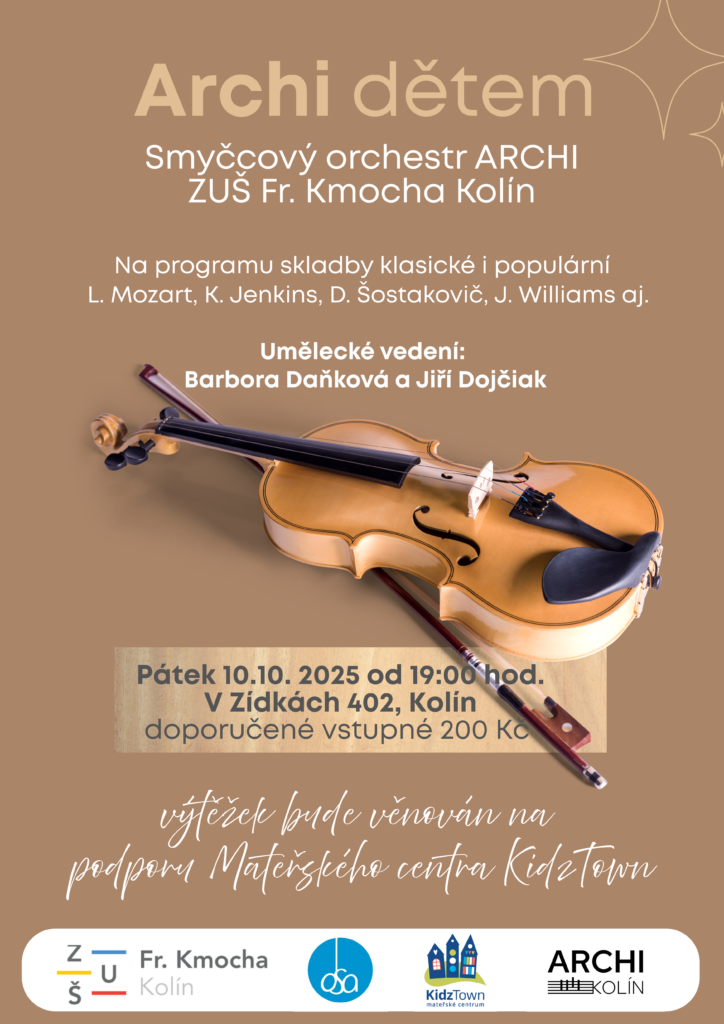 🎻 Pozvánka na koncert smyčcového orchestru Archi 🎻 Srdečně vás zveme na koncert smyčcového orchestru Archi, který se uskuteční 10. října od 19:00 v budově Apoštolské církve v Kolíně. Dospělí i děti budou hrát na podporu našeho Mateřského centra KidzTown...