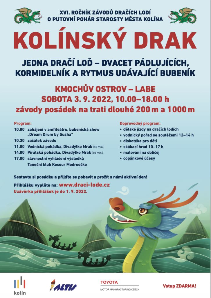 Srdečně vás zveme na letošní závod dračích lodí, kterého se mimo jiné zúčastní i maminky z našeho centra. V Počtu dvaceti pádlujících maminek si poměříme síly s ostatními posádkami. Přijďte fandit, čekáme vás! KOLÍNSKÝ DRAK … jedna dračí loď –...
