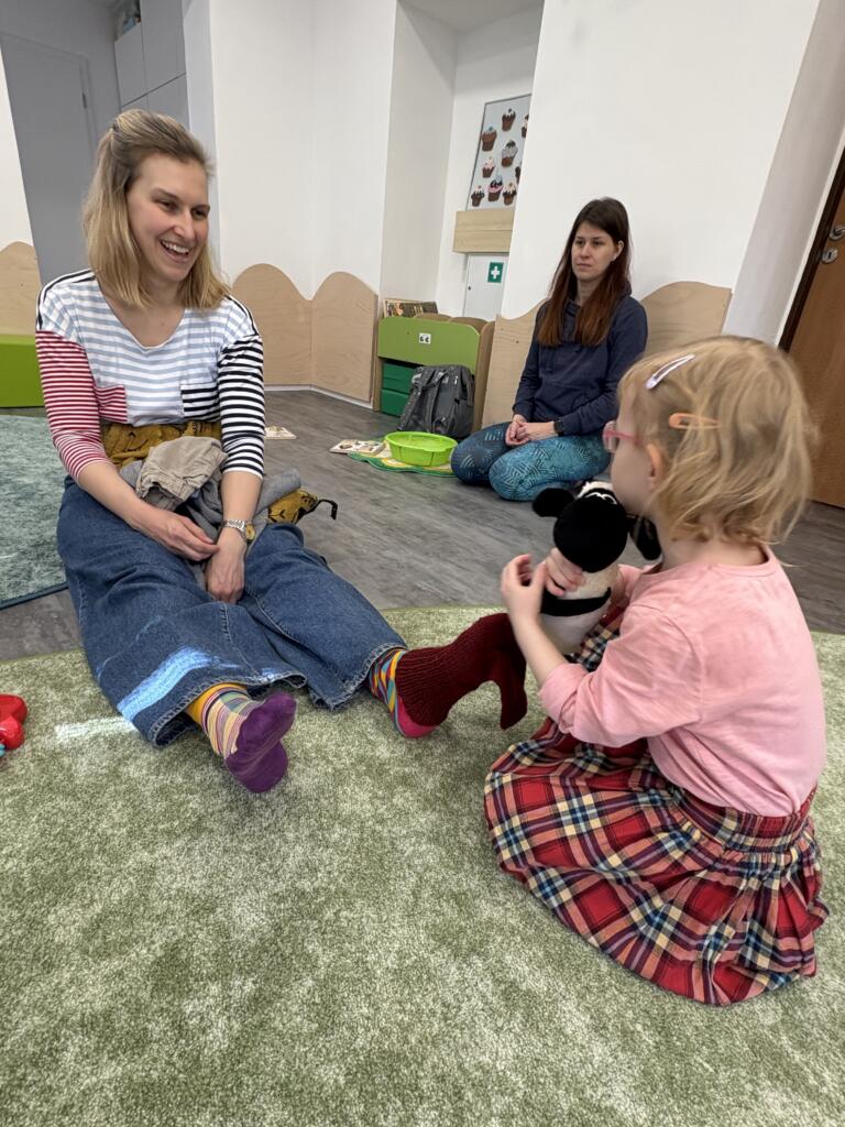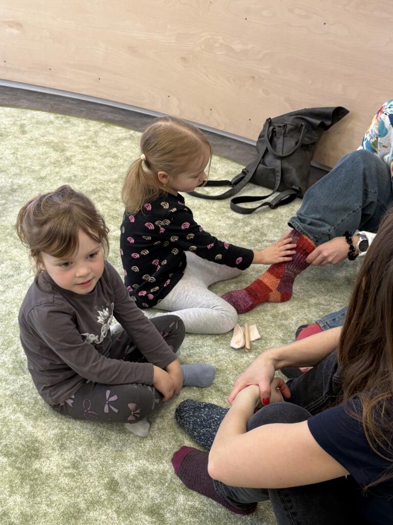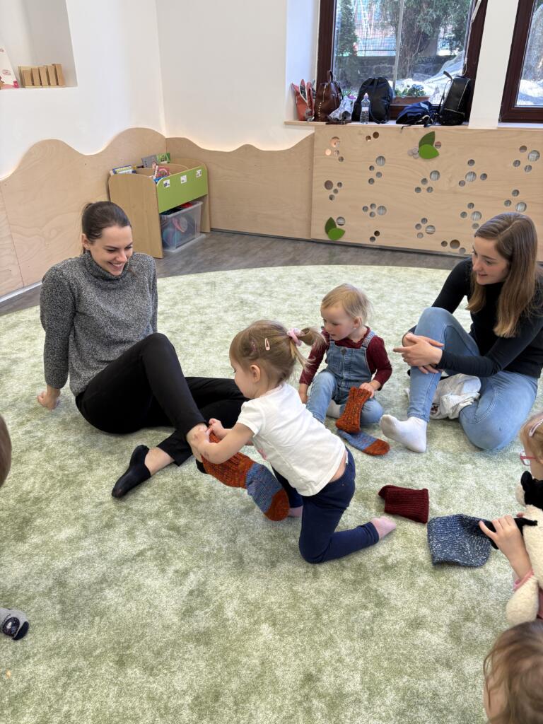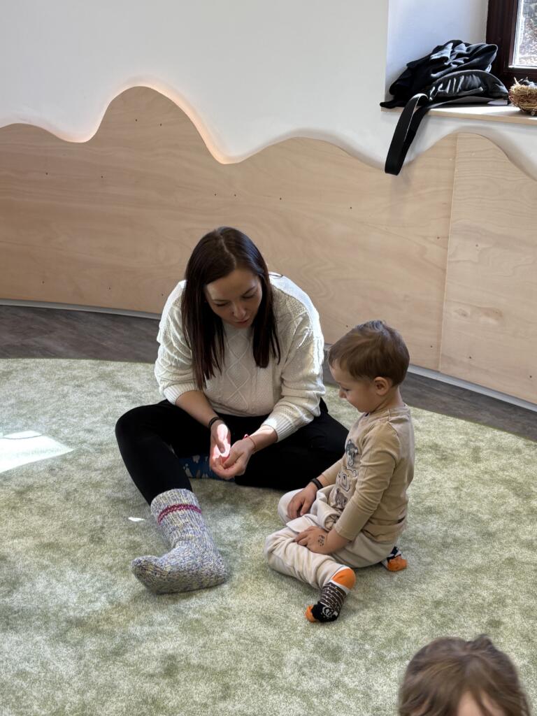 Nechyběly ani praktické a smyslové aktivity – ponožky jsme společně třídili, poznávali podle barev a velikostí, učili se je správně oblékat „mamince“ a hráli si s nimi tak, aby děti rozvíjely jemnou motoriku i samostatnost.