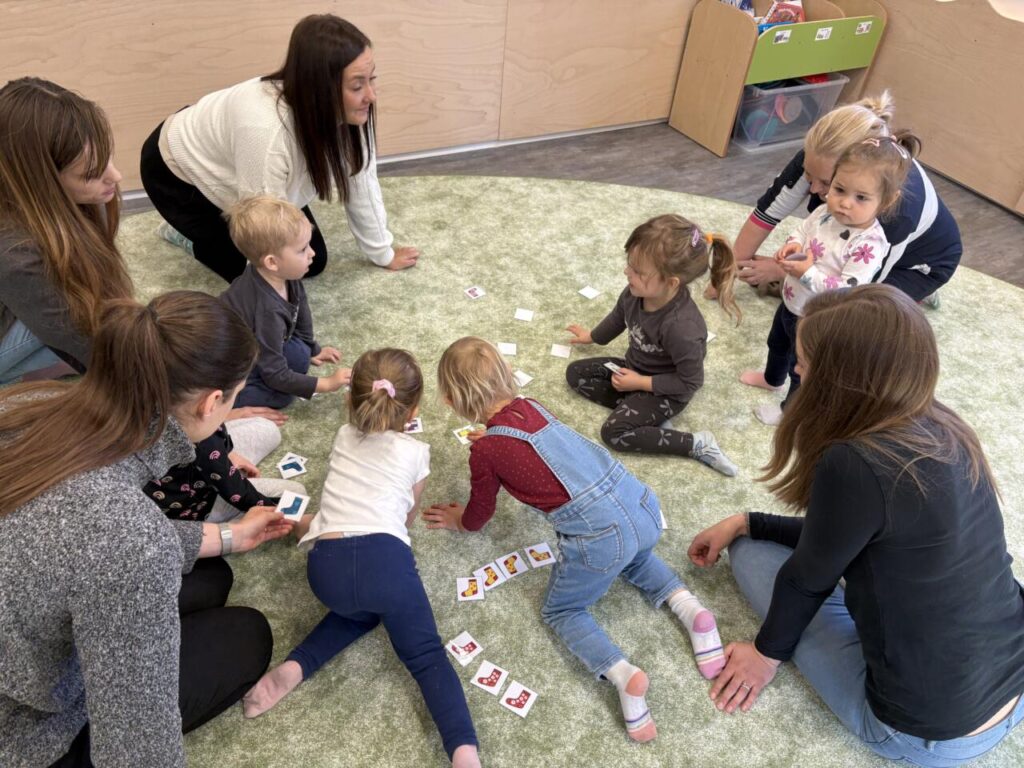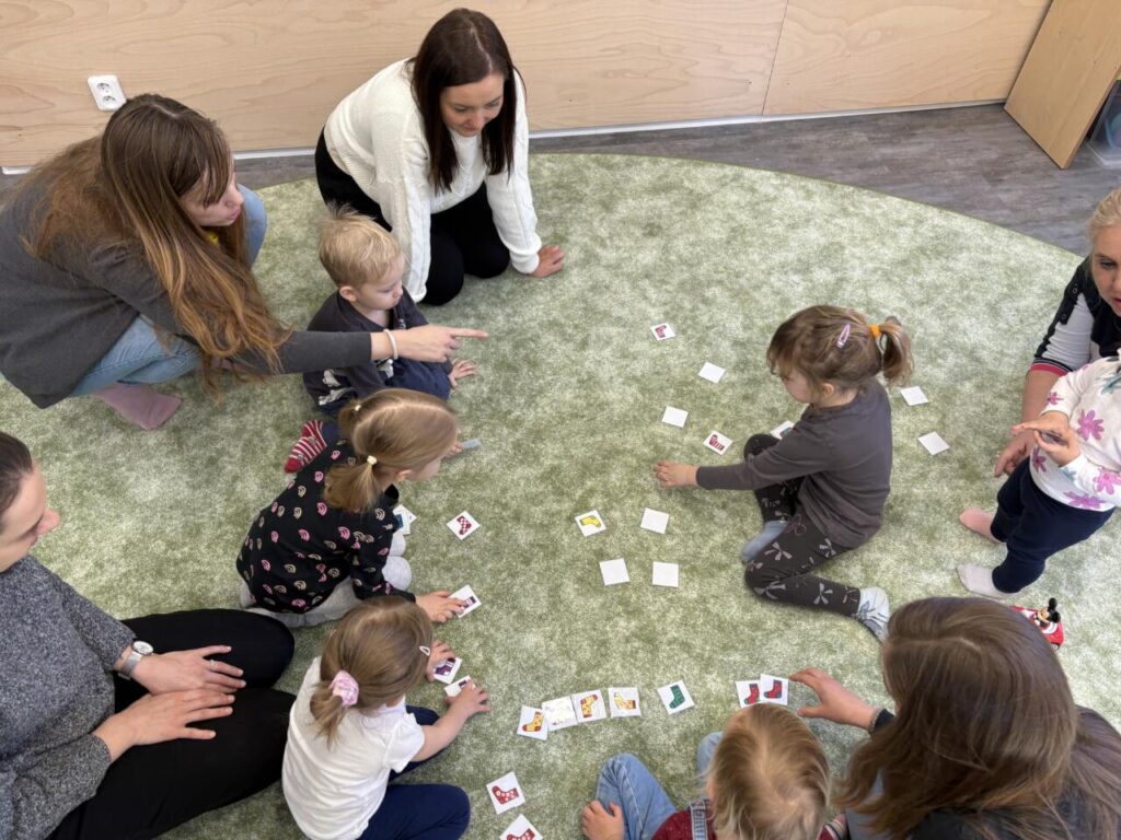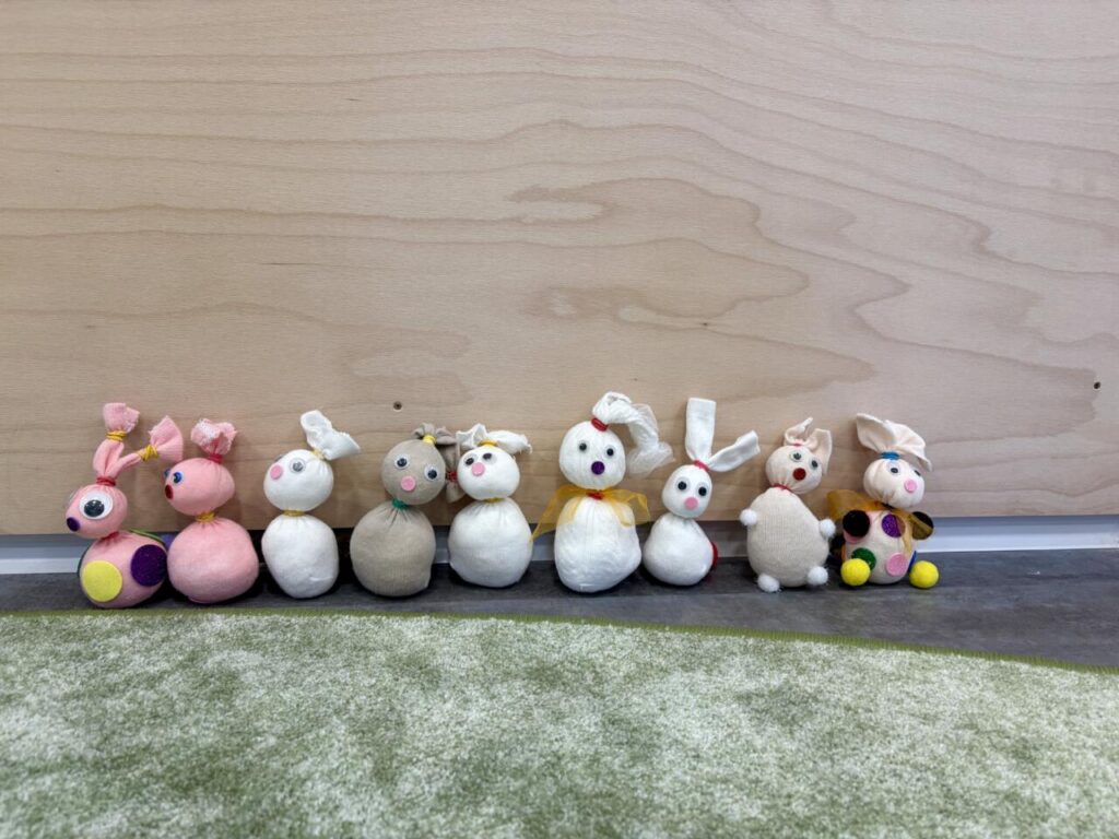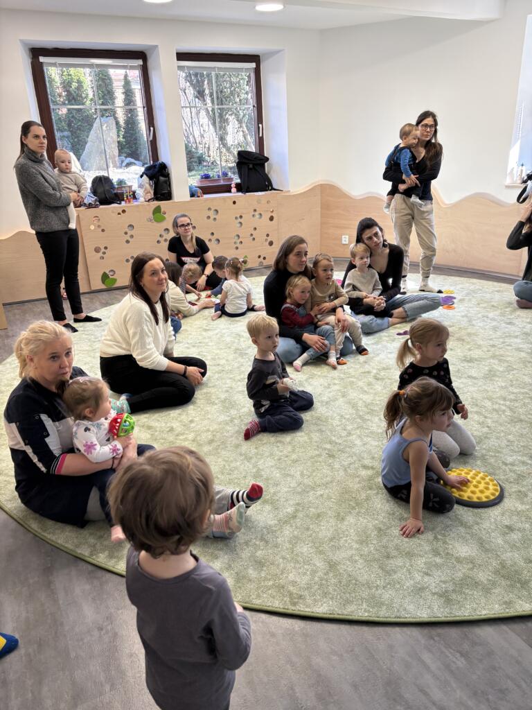 Nechyběly ani praktické a smyslové aktivity – ponožky jsme společně třídili, poznávali podle barev a velikostí, učili se je správně oblékat „mamince“ a hráli si s nimi tak, aby děti rozvíjely jemnou motoriku i samostatnost.
